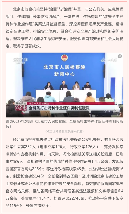 3月8日,最高人民檢察院黨組書記、檢察長應勇在第十四屆全國人民代表大會第二次會議上作最高人民檢察院工報告,報告中著重提到關鍵詞特種作業假操作證溯源治理工作及成效。據報告顯示,北京檢察機關深挖辦案中發現的涉及上萬張特種作業假操作證問題,推動查辦制販假證人員126人,督促主管部門落實監管責任,溯源整治假冒國家機關官方網站226個。
