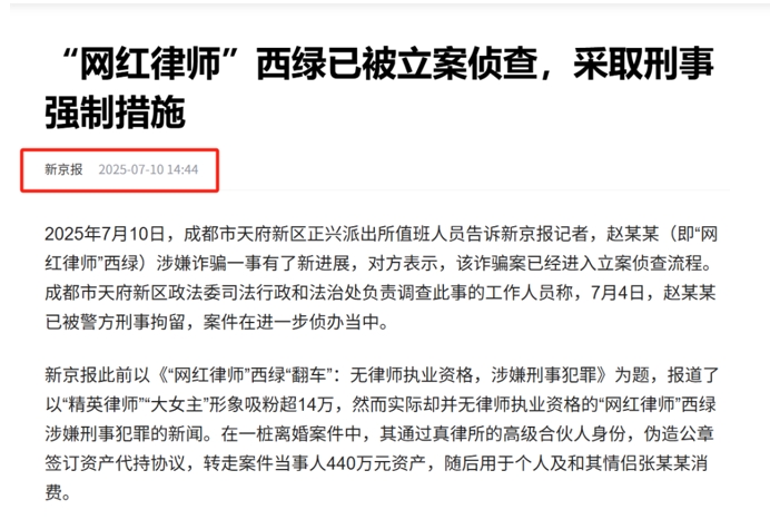 近日,擁有14萬粉絲的成都 “網(wǎng)紅律師”西綠趙某假身份一事,引發(fā)廣泛關(guān)注。消息稱,這名打造“精英女律師”人設的網(wǎng)絡紅人,實際上并無律師執(zhí)業(yè)資格。