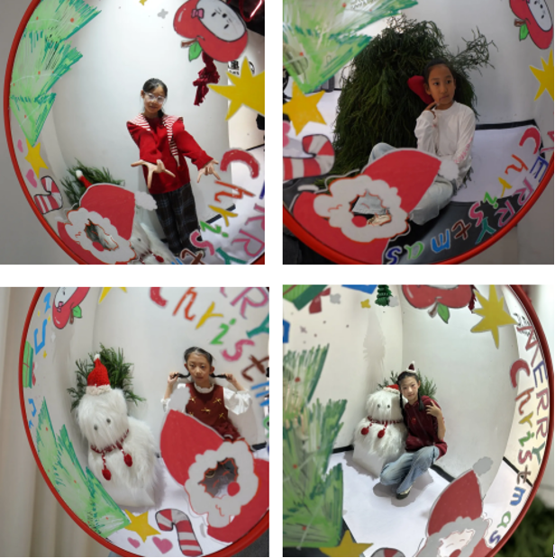 圣誕主題的哈哈鏡成了現場的“快樂焦點”,鏡面上手繪的圣誕襪、圣誕樹、Merry Christmas字樣,與變形后的童趣畫面相映成趣。孩子們湊到鏡前,看著鏡中或高或矮、或胖或瘦的自己,忍不住哈哈大笑,有的對著鏡子比出可愛的剪刀手,有的模仿起模特課堂上學到的專業pose,鏡頭抓拍下的每一個搞怪表情,都成了圣誕最鮮活的紀念。