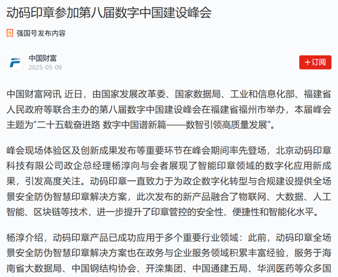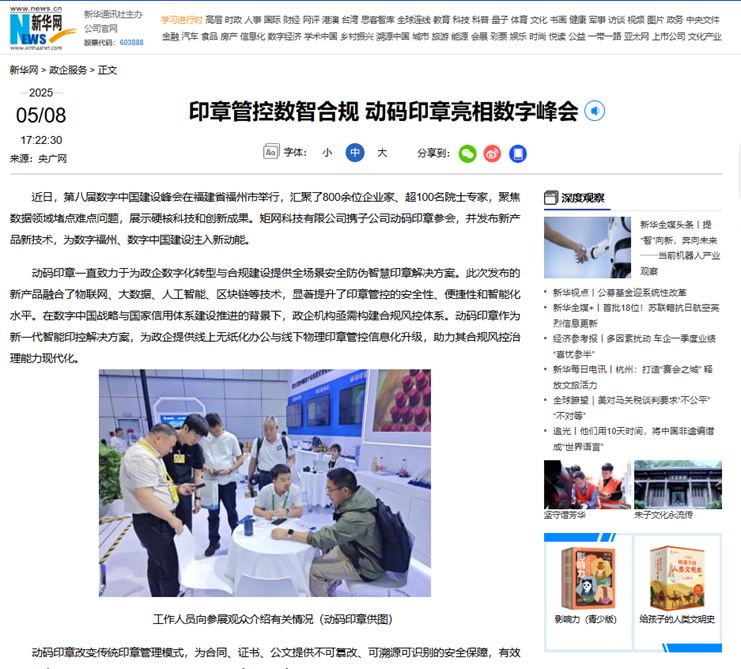 第八屆數(shù)字中國(guó)建設(shè)峰會(huì)在福建省福州市舉行,匯聚了800余位企業(yè)家、超100名院士專家,聚焦數(shù)據(jù)領(lǐng)域堵點(diǎn)難點(diǎn)問(wèn)題,展示硬核科技和創(chuàng)新成果。矩網(wǎng)科技有限公司攜子公司動(dòng)碼印章參會(huì),并發(fā)布新產(chǎn)品新技術(shù),為數(shù)字福州、數(shù)字中國(guó)建設(shè)注入新動(dòng)能。動(dòng)碼印章獲新華網(wǎng)、央廣網(wǎng)、學(xué)習(xí)強(qiáng)國(guó)平臺(tái)、人民政協(xié)網(wǎng)等多家媒體及中國(guó)防偽行業(yè)協(xié)會(huì)、中國(guó)安防協(xié)會(huì)、河南省數(shù)字經(jīng)濟(jì)產(chǎn)業(yè)協(xié)會(huì)公眾號(hào)關(guān)注報(bào)道。