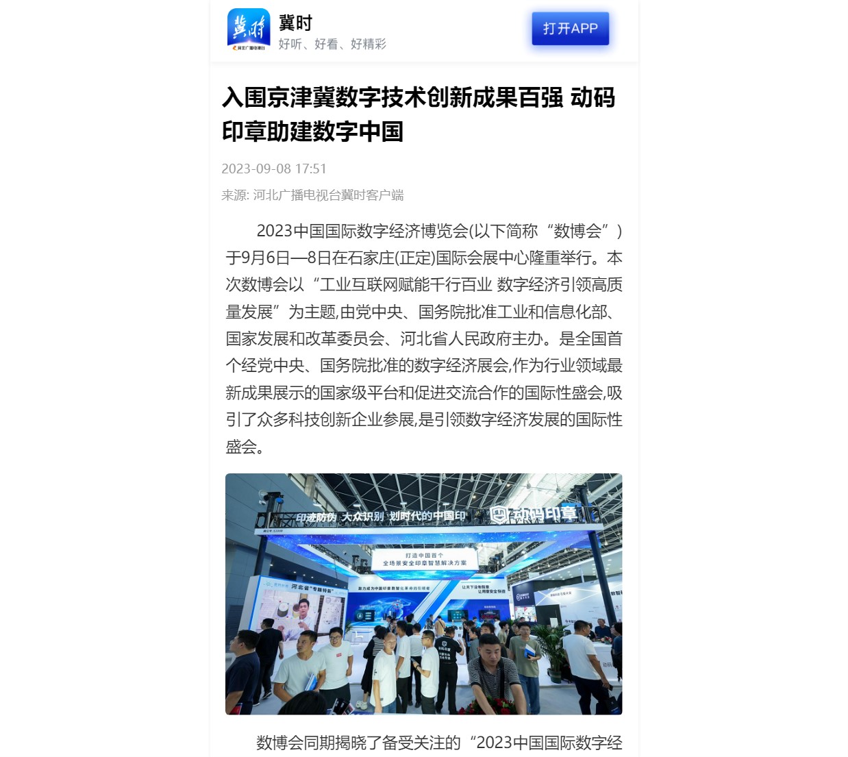 新華社、河北新聞網、1012交通廣播、1012在路上、中國商報、河北工人報、香港商報、河青新聞網、燕趙新聞網等多家新聞媒體相繼來到展位進行采訪報道,稱動碼印章在解決傳統印章存在的易偽造、印跡無法防偽、大眾無法鑒別真假等問題,具有重要的創新意義及廣闊的應用前景;為促進河北工業互聯網創新發展,推動工業化和信息化深度融合提供了新思路。